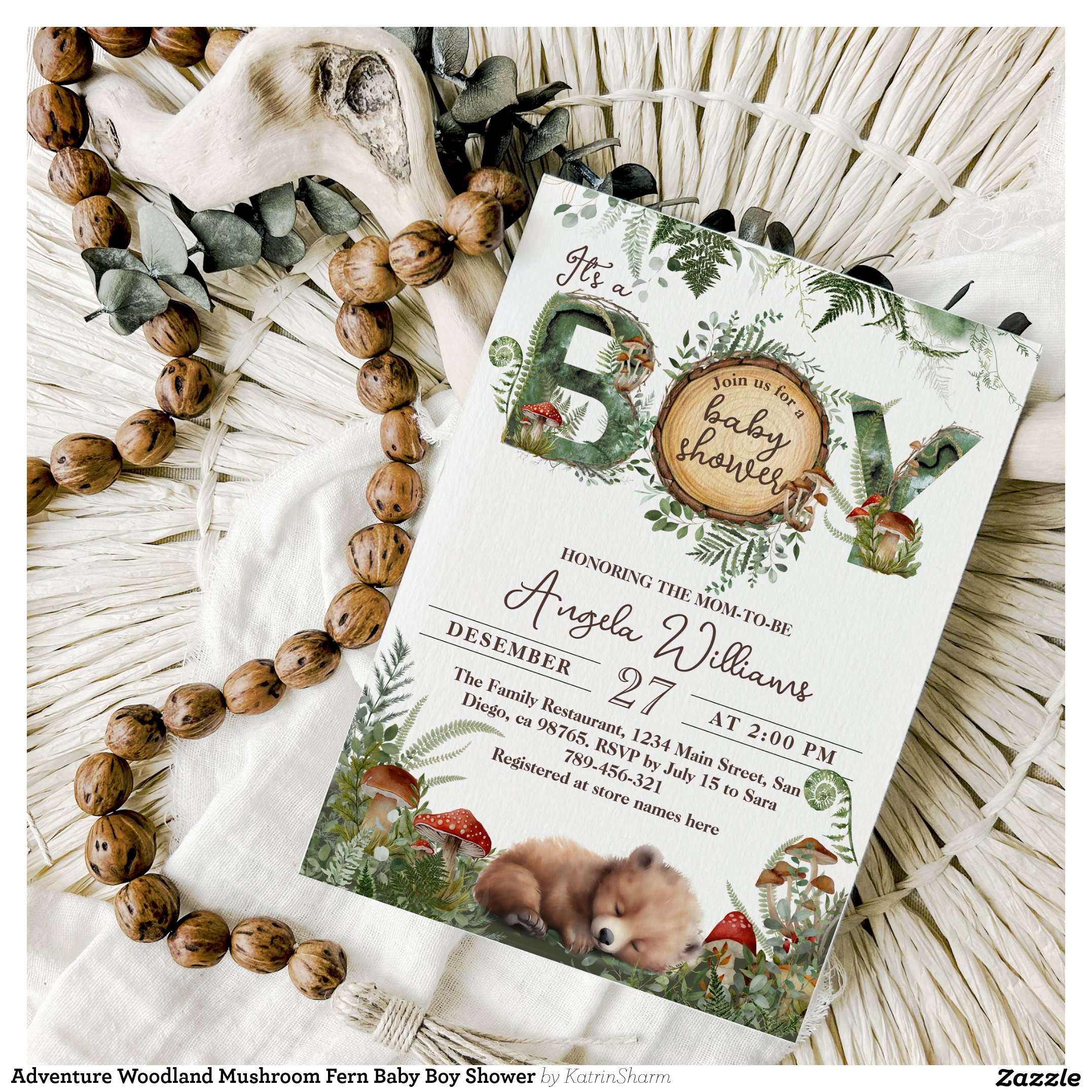 Adventure Woodland Mushroom Fern Baby Boy Shower Invitation