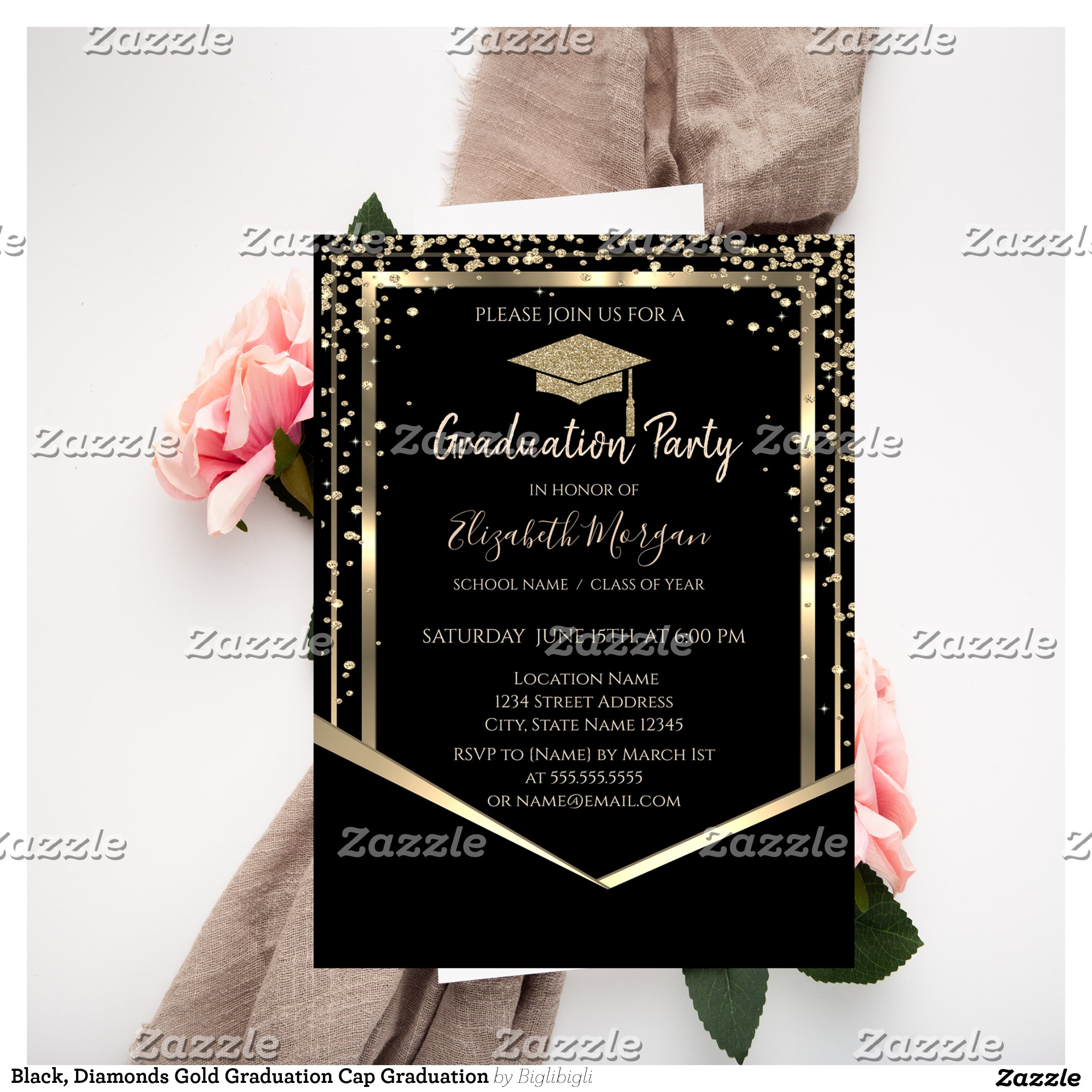 Black, Diamonds Gold Graduation Cap Graduation Invitation