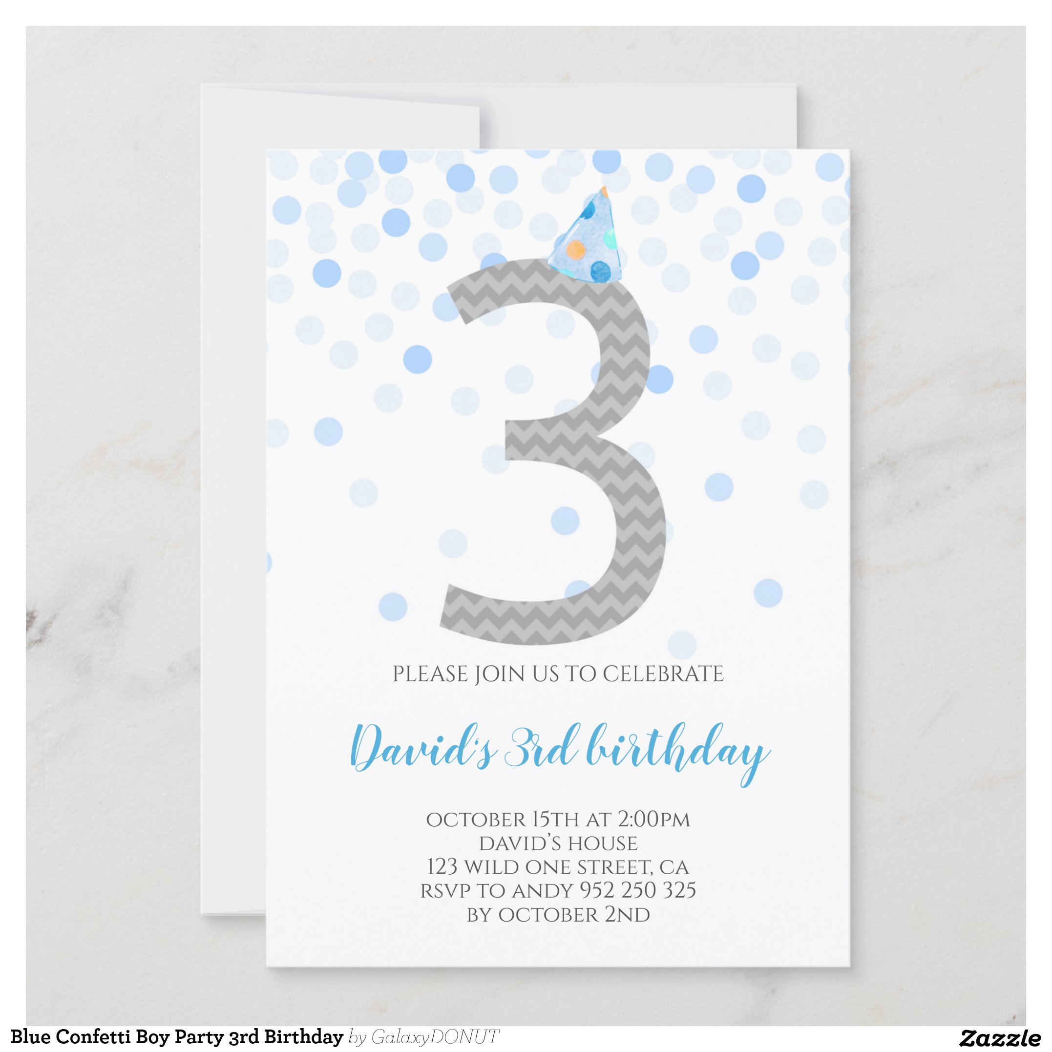 Blue Confetti Boy Party 3rd Birthday Invitation