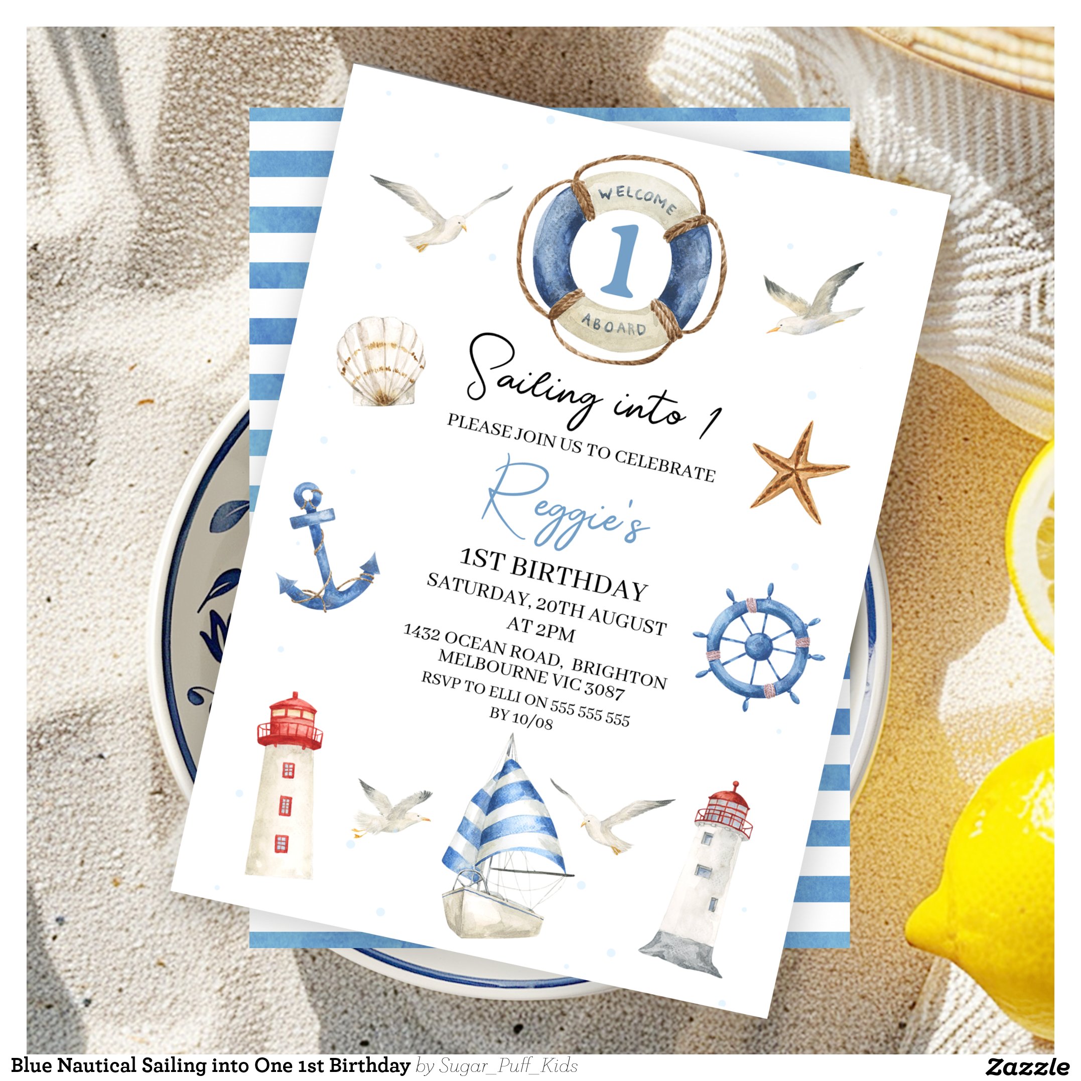 Blue Nautical Sailing into One 1st Birthday Invitation