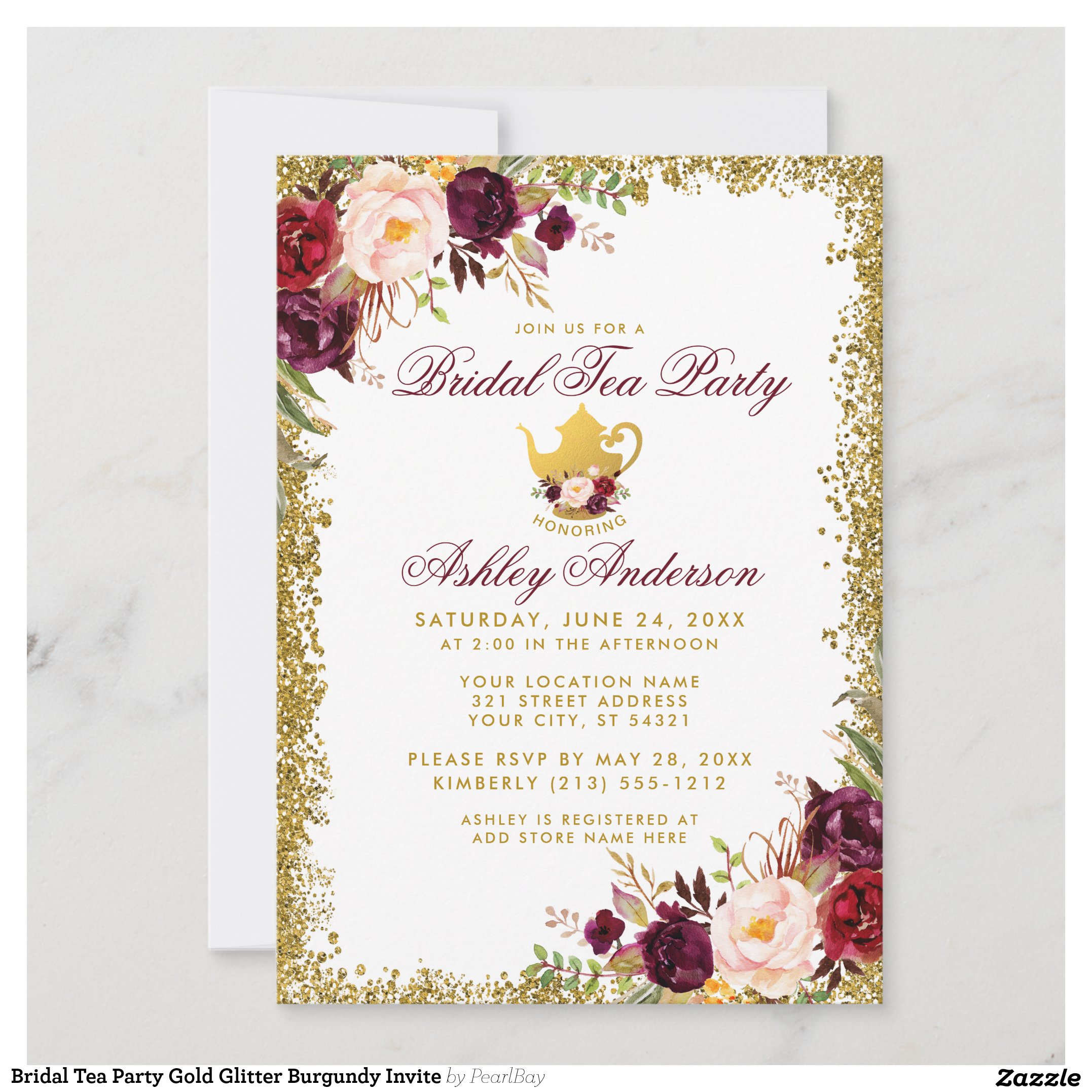 Bridal Tea Party Gold Glitter Burgundy Invite
