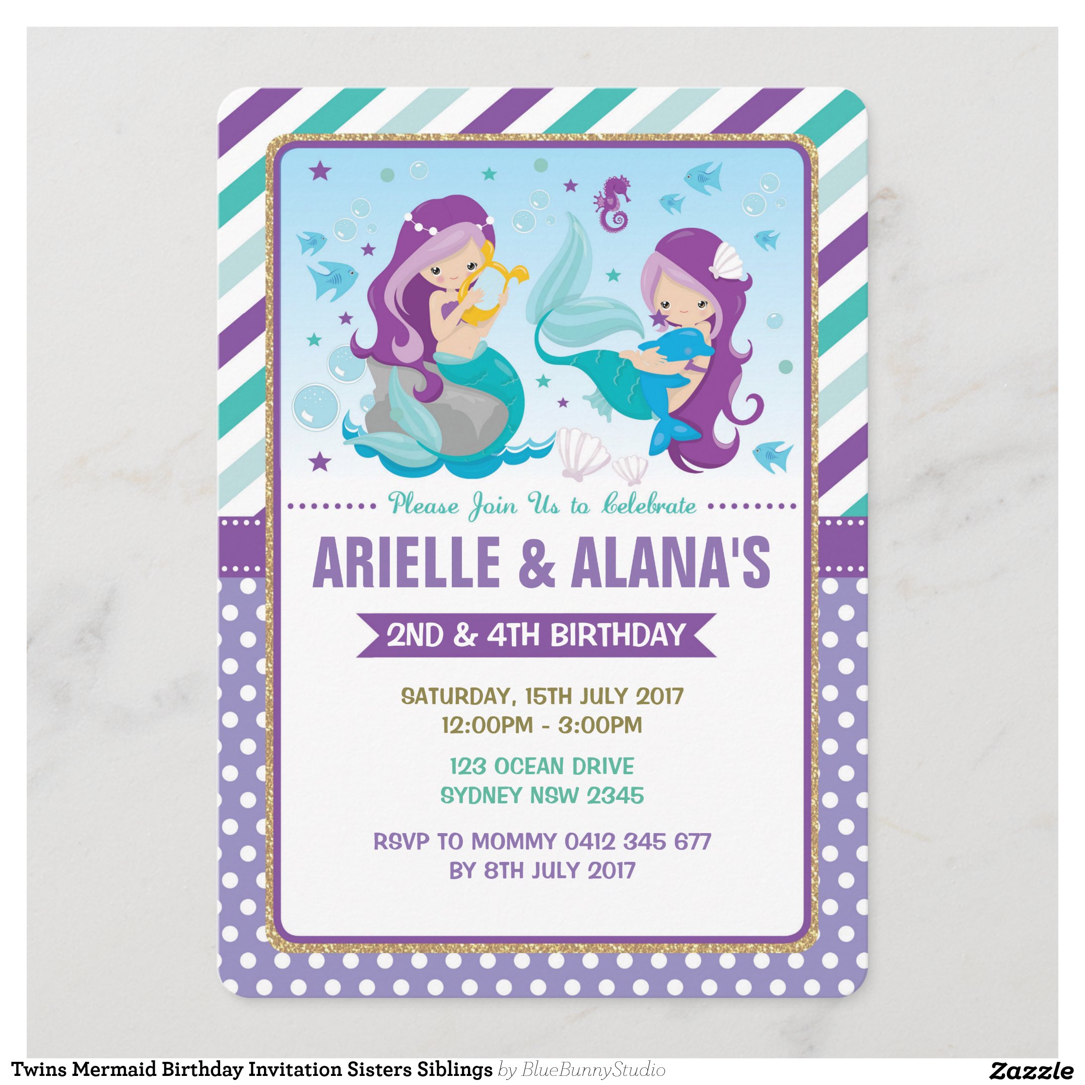 Twins Mermaid Birthday Invitation Sisters Siblings
