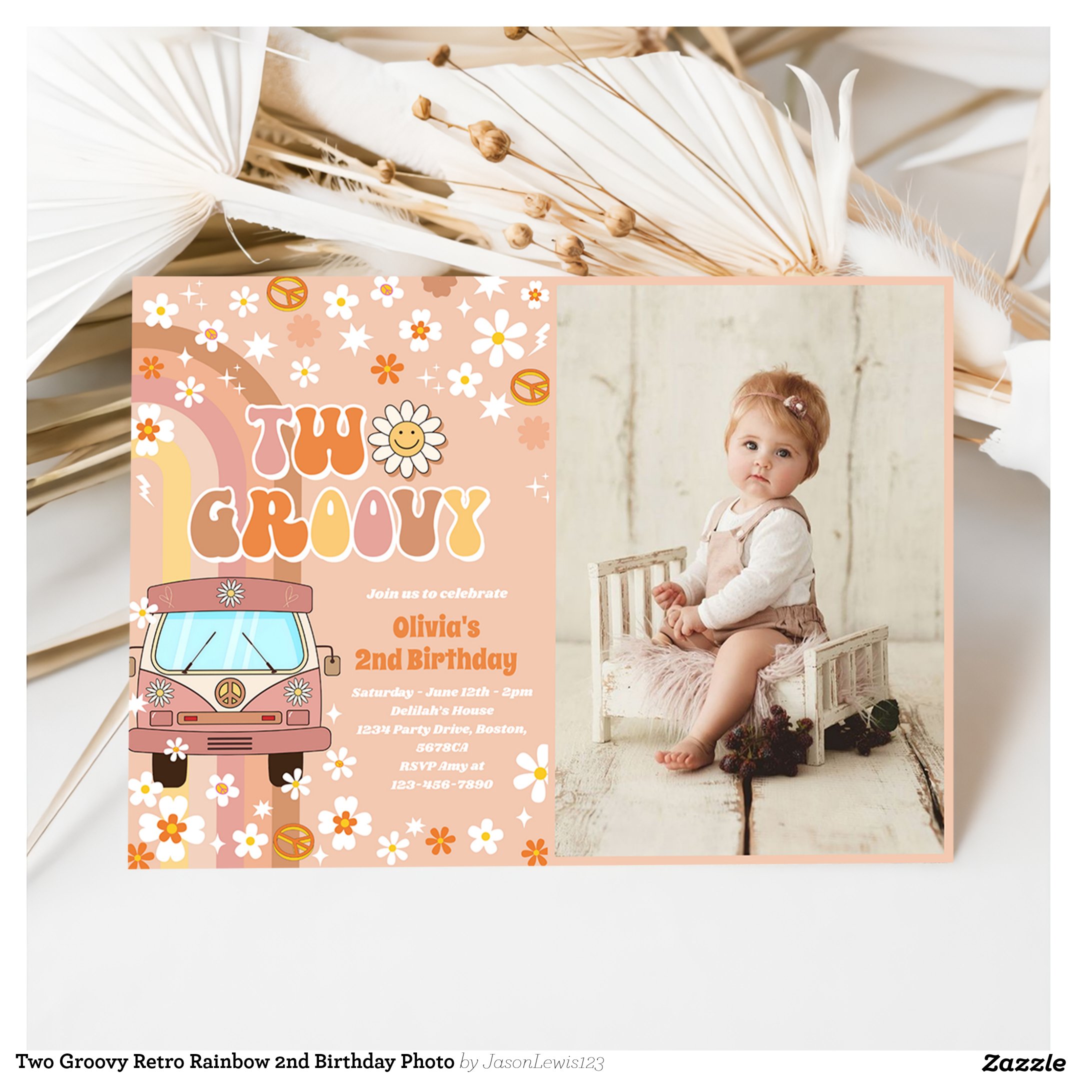 Two Groovy Retro Rainbow 2nd Birthday Photo Invitation