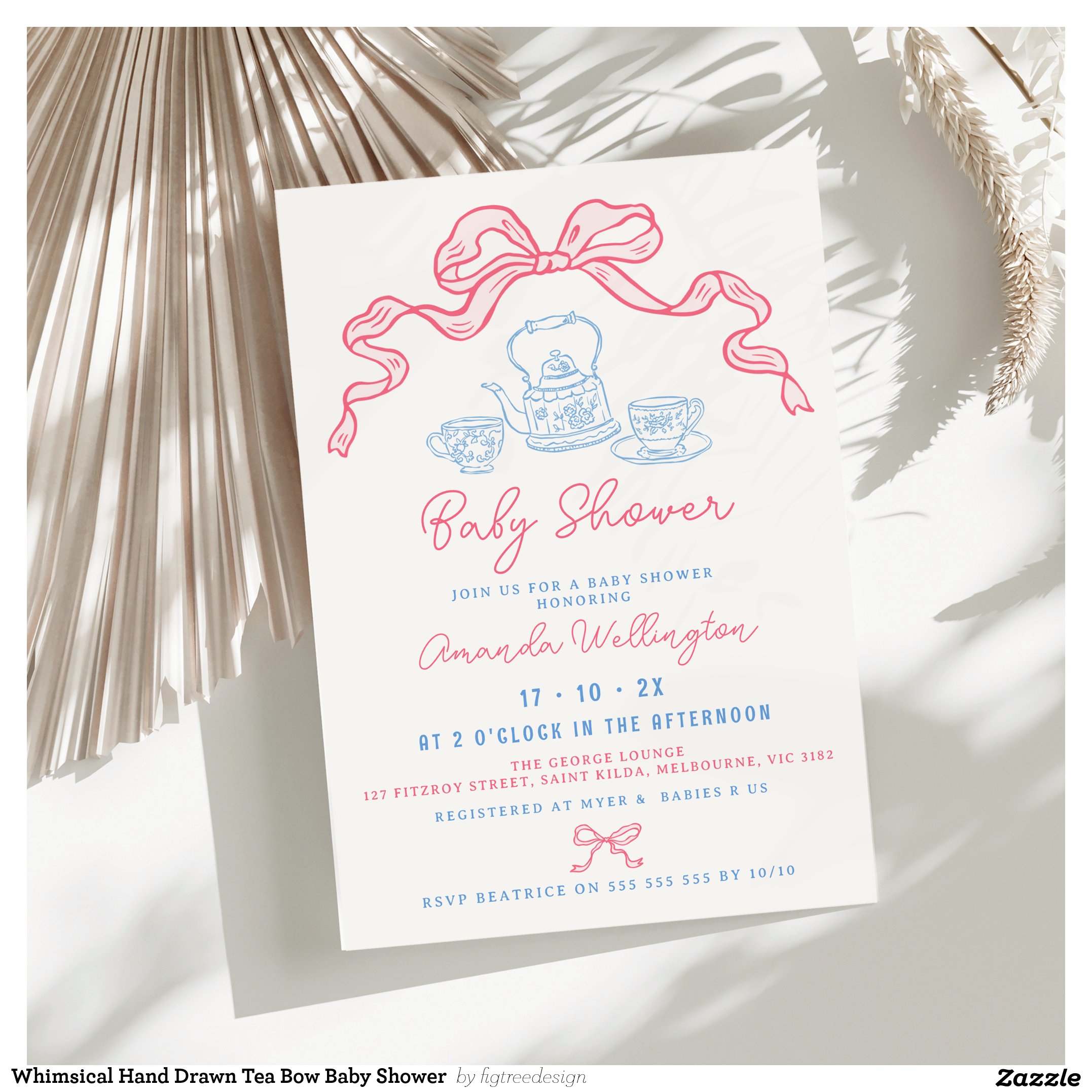 Whimsical Hand Drawn Tea Bow Baby Shower Invitation